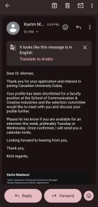 وأشار إلى أن ارتباطه بعمله الحالي، حال دون استكمال إجراءات المقابلة في الوقت الراهن، مع ترحيبه بفرص التعاون المستقبلي مع الجامعة الكندية في دبي من خلال ورش تدريبية ومحاضرات متخصصة عبر الإنترنت.